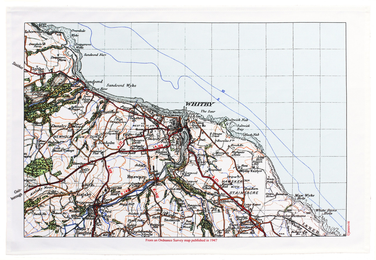 A white cotton tea towel printed with a detailed map of the seaside town of Whitby on the Yorkshire coast with its ruined Abbey overlooking the harbour. The original map was published in 1947 by Ordnance Survey. A perfect gift for anyone who has visited the town.